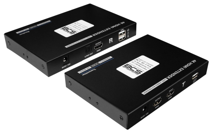 Extender HDMI po skrętce UTP BCS-UTP-KVM-4K(2). Zestaw urządzeń do transmisji sygnału HDMI 4K przy pomocy przewodu UTP na odległość do około 70 metrów (w zależności od jakości kabla). Zestaw składa się z dwóch urządzeń nadajnika i odbiornika. Extender w aluminiowej obudowie.
