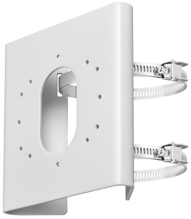 Obejma słupowa, uchwyt BCS-V-ASM. Produkt można montować wewnętrzny pomieszczeń jak również na zewnątrz. W zestawie z uchwytem znajdują się dwie stalowe opaski zaciskowe. Uchwyt słupowy posiada otwory montażowe dostosowane do kamer serii BCS VIEW.