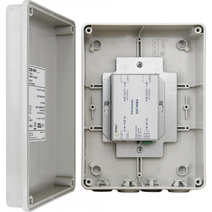 Extender EXT-POE4H PULSAR. Urządzenie umieszczone w hermetycznej obudowie IP56. Extender zwiększa zasięg danych Ethernet oraz zasilania PoE o kolejne 100 metrów. Może być zasilany ze switcha PoE lub innego urządzenia zgodnego ze standardem PoE (wejście PoE IN) lub z zewnętrznego zasilacza o napięciu 44-57VDC (wejście DC IN).