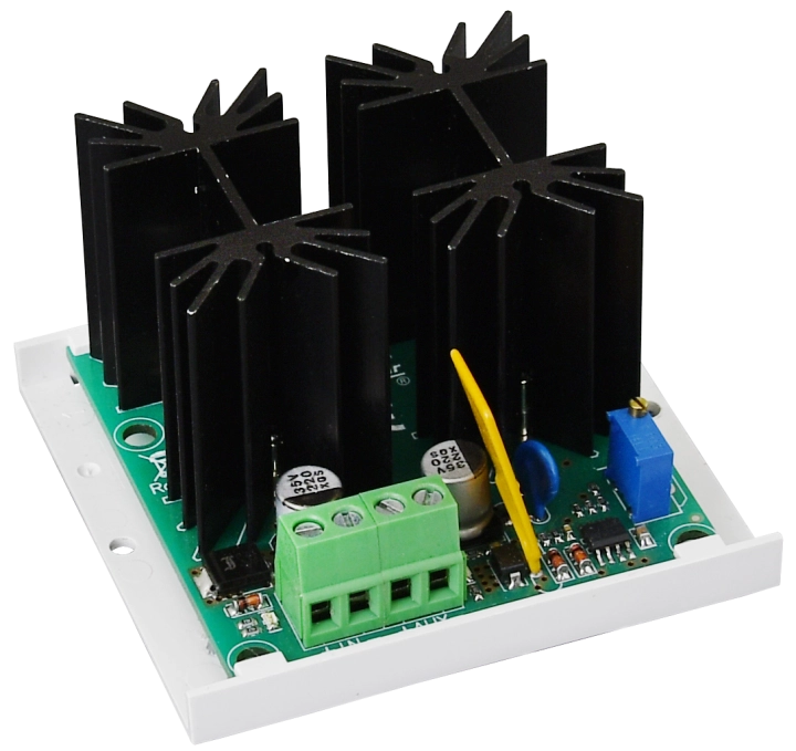 Reduktor napięcia RN 12V/5A - RN500 PULSAR, służy do obniżenia i stabilizacji napięcia DC z zakresu 12÷14V do wartości 12V (regulacja 11V÷Uin DC). W przypadku, gdy napięcie wejściowe spadnie poniżej progu ustawionego napięcia wyjściowego, następuje całkowite otwarcie tranzystora i reduktor przewodzi bezstratnie (spadek napięcia ΔU<1%). Pozwala to na pełne wykorzystanie energii zgromadzonej w akumulatorze zasilacza przy pracy bateryjnej.