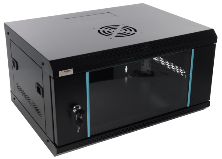 Szafa RACK 19" Pulsar RWA454-B w czarnej obudowie o głębokości 400 mm. Umożliwia montaż urządzeń sieciowych o sumarycznej wyskości 4U. Z powodzeniem może być zastosowana w systemach CCTV, KD, SSWiN, RTV, LAN w małych firmach lub domach. Szkielet szafy przygotowany został na obciążenie do 30 kg. Z przodu znajdują się drzwi frontowe ze szkła hartowanego o grubości 4 mm, wyposażone w zamek RAZ-G1. Boczne drzwi szafy instalowane są na specjalnych zawiasach, które ułatwiają demontaż drzwi przy rutynowych czynnościach serwisowych. Ponadto w płycie górnej znajduje się otwór wentylacyjny 105x105 mm, a zarówno w górnej jak i dolnej płycie zawarte są wpusty kablowe o wymiarach 175 x 58 mm.