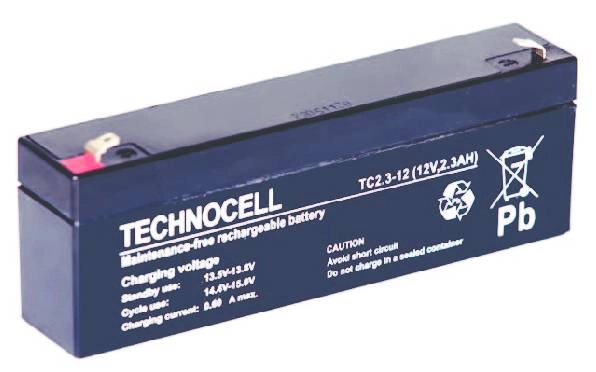 Akumulator bezobsługowy TC2.3-12 firmy Technocell. Bateria o pojemności 2.3Ah przeznaczona do pracy w systemach alarmowych lub jako zasilanie awaryjne kas i drukarek fiskalnych.