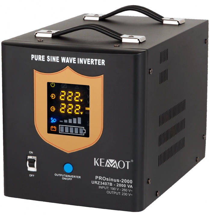 Systemy awaryjnego zasilania KEMOT chronią wybrane urządzenia przed zakłóceniami zasilania, których konsekwencją może być zaburzenie lub też przerwanie ich pracy. Seria urządzeń PROsinus marki KEMOT doskonale sprawdzi się jako awaryjne zasilanie pomp CO lub pomp w instalacjach kominków, a także silników indukcyjnych, czy np. urządzeń automatyki instalacji z wykorzystaniem konwektorów ciepła oraz wszelkich urządzeń wyjątkowo wrażliwych na najmniejsze zmiany kształtu napięcia. Zaletą zasilaczy awaryjnych KEMOT jest czysty sinusoidalny przebieg napięcia wyjściowego (zasilającego odbiory), dzięki któremu urządzenie zapewnia stabilną pracę, zapobiegając efektowi przegrzewania się odbiorów indukcyjnych. Wraz z akumulatorem 12V (akumulator należy nabyć osobno) stanowią kompletne urządzenie zasilania gwarantowanego 230 VAC.