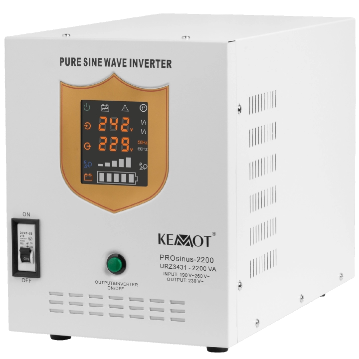 Systemy awaryjnego zasilania KEMOT chronią wybrane urządzenia przed zakłóceniami zasilania, których konsekwencją może być zaburzenie lub też przerwanie ich pracy. Seria urządzeń PROsinus marki KEMOT doskonale sprawdzi się jako awaryjne zasilanie pomp CO lub pomp w instalacjach kominków, a także silników indukcyjnych, czy np. urządzeń automatyki instalacji z wykorzystaniem konwektorów ciepła oraz wszelkich urządzeń wyjątkowo wrażliwych na najmniejsze zmiany kształtu napięcia. Zaletą zasilaczy awaryjnych marki KEMOT jest czysty sinusoidalny przebieg napięcia wyjściowego (zasilającego odbiory), dzięki któremu urządzenie zapewnia stabilną pracę, zapobiegając efektowi przegrzewania się odbiorów indukcyjnych. Wraz z akumulatorem 12V (akumulator należy nabyć osobno) stanowią kompletne urządzenie zasilania gwarantowanego 230 VAC.